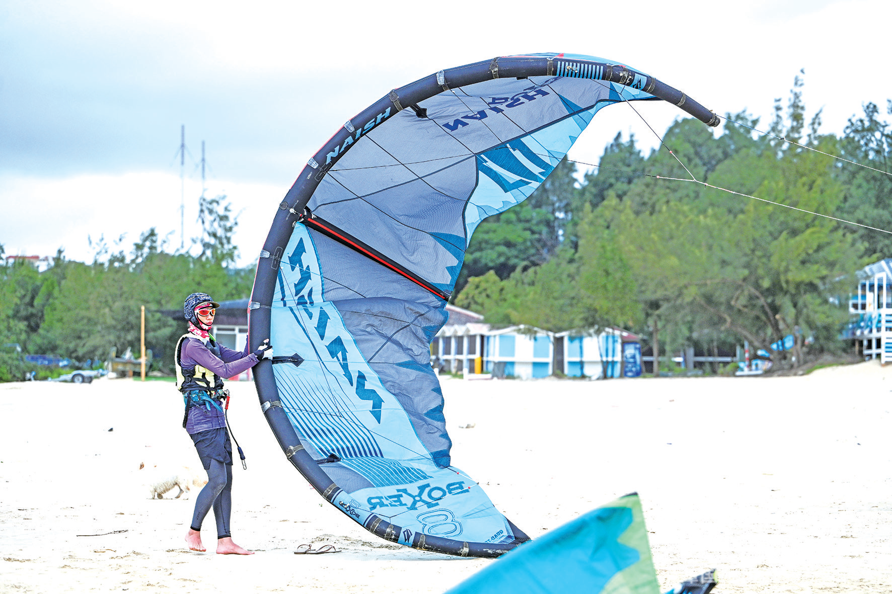 風(fēng)箏沖浪愛好者在調(diào)整自己的風(fēng)箏。