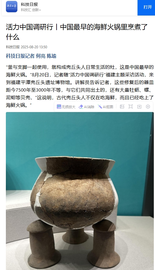 “釜與支腳一起使用,就構成殼丘頭人日常生活的灶,這是中國最早的海鮮火鍋。”8月20日,記者隨“活力中國調(diào)研行”福建主題采訪活動,來到福建平潭殼丘頭遺址博物館。講解員告訴記者,這些修復后的器皿距今7500年至3000年不等,與它們共同出土的,還有大量牡蠣、螺、泥蚶等貝殼,“這說明,古代殼丘頭人不僅在吃海鮮,而且已經(jīng)吃上了海鮮火鍋?!?/p>