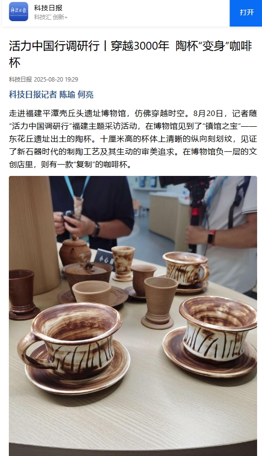 走進福建平潭殼丘頭遺址博物館,仿佛穿越時空。8月20日,記者隨“活力中國調(diào)研行”福建主題采訪活動,在博物館見到了“鎮(zhèn)館之寶”——東花丘遺址出土的陶杯。十厘米高的杯體上清晰的縱向刻劃紋,見證了新石器時代的制陶工藝及其生動的審美追求。在博物館負一層的文創(chuàng)店里,則有一款“復制”的咖啡杯。